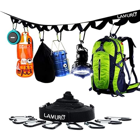 Amazon Com Campsite Storage Strap With 19 Separated Loops For Hanging Camping Equipment Gear And Supplies Includes Carabiner Hooks And Clothes Pins Durable Campground Organizer Holds Up To 150 Lbs Sports Outdoors